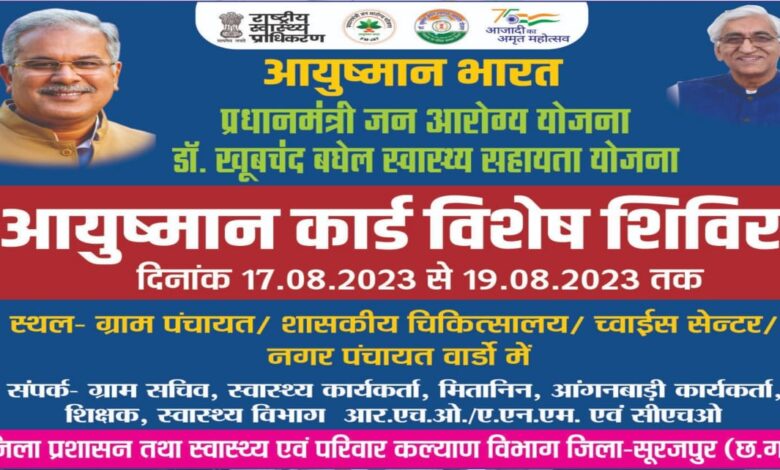 सूरजपुर/आयुष्मान भारत डॉ. खूबचंद बघेल स्वास्थ्य सहायता योजना के अंतर्गत छूते हुए हितग्राहियों के पंजीयन हेतु 17 से 19 अगस्त 2023 तक जिले के समस्त ग्राम पंचायत स्वास्थ्य केंद्रों तथा नगरी निकायों में आयुष्मान कार्ड बनाने हेतु विशेष शिविर का आयोजन किया जा रहा है। कलेक्टर के निर्देशानुसार में जिले के समस्त नागरिकों को स्वास्थ्य सुविधा उपलब्ध कराना सुनिश्चित किया जाना है ।सभी के सहयोग से जिला प्रशासन के कुशल नेतृत्व में हमने विगत 5 दिनों (27 से 31 जुलाई 2023) में कुल 58 हजार आयुष्मान कार्ड का निर्माण कर लोगों के भविष्य को सुरक्षित किया है। आयुष्मान कार्ड के इस निरंतरता एवं सफलता को देखते हुए जिला प्रशासन ने यह निर्णय लिया है कि इस आयुष्मान कार्ड निर्माण अभियान विशेष शिविर 17 से 19 अगस्त 2023 तक आयुष्मान कार्ड निर्माण शिविर को निरन्तर करना है एवं छूटे हुए लोगों का आयुष्मान कार्ड बनाना है।तदानुसार आप सभी से निवेदन है कि इस आयुष्मान कार्ड निर्माण शिविर को निरन्तर करते हुए शत प्रतिशत लोगों (छूटे हुए लोगों) का आयुष्मान कार्ड बनाये जाने के लिए मुख्य चिकित्सा एवं स्वास्थ्य अधिकारी डॉ. आर. एस. सिंह ने सभी जिले के नागरिकों से अपील की गई है कि जिनका आयुष्मान कार्ड नहीं बना है।