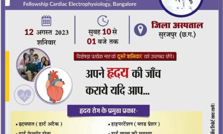 सूरजपुर-कलेक्टर संजय अग्रवाल के निर्देशानुसार एवं मुख्य चिकित्सा एवं स्वास्थ्य अधिकारी डॉ. आर. एस. सिंह तथा वरिष्ठ विशेषज्ञ सह अस्पताल अधीक्षक डॉ. के. एल. ध्रुव के मार्गदर्शन में 12 अगस्त को प्रातः 10ः00 बजे से 01ः00 बजे तक जिला स्वास्थ्य समिति सूरजपुर एवं रामकृष्ण केयर हॉस्पिटल रायपुर के संयुक्त तत्वाधान में जिला चिकित्सालय सूरजपुर में निःशुल्क हृदय रोग जांच परामर्श शिविर का आयोजन किया जाना है। जिसमें हृदय रोग विशेषज्ञ डॉ. जावेद परवेज ओपीडी नम्बर 05 में उपस्थित होकर परामर्श देंगे। मुख्य चिकित्सा एवं स्वास्थ्य अधिकारी डॉ. आर.एस. सिंह ने बताया कि लोगों को बेहतर स्वास्थ्य सुविधा प्रदान करने के लिये इस तरह के कैम्प का आयोजन किया जा रहा है, तथा डा. सिंह ने जिले के समस्त लोगों से अपील किया गया है कि जितने भी हृदय रोग के संभावित मरीज हैं।