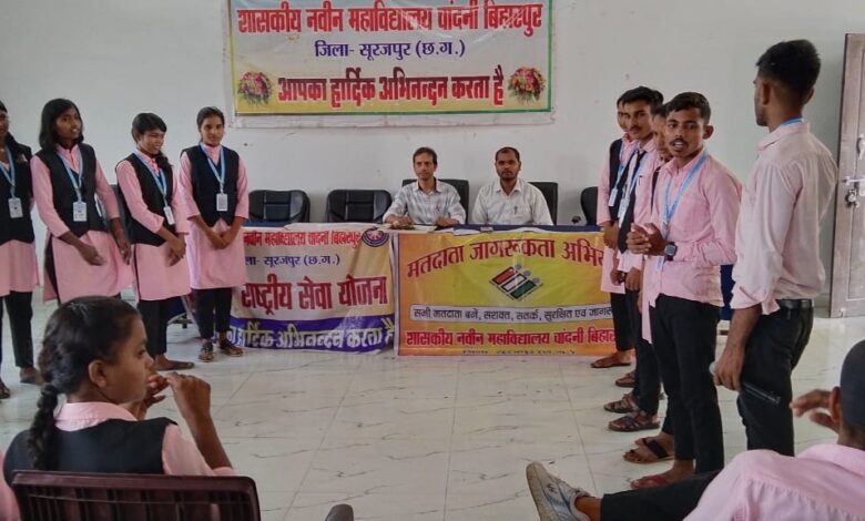 सूरजपुर।शासकीय नवीन महाविद्यालय चांदनी बिहारपुर में आज मतदाता जागरूकता अभियान के तहत महाविद्यालय के प्रोफेसर स्वीप नोडल धीरेंद्र कुमार जायसवाल के संचालन में और अतिथि व्याख्याता राम निवास पटेल और अन्य शिक्षकों वं छात्र छात्राओं के सहयोग से महाविद्यालय में विविध कार्यक्रम परिचर्चा, निबंध लेखन,नारा लेखन,नुक्कड़ नाटक आदि आयोजित कर छात्र-छात्राओं के माध्यम से नए मतदाताओं को जोड़ने और अधिक से अधिक संख्या में लोग मतदान करने के प्रति जागरूक हो,इसके लिए प्रयास किया जा रहा है।