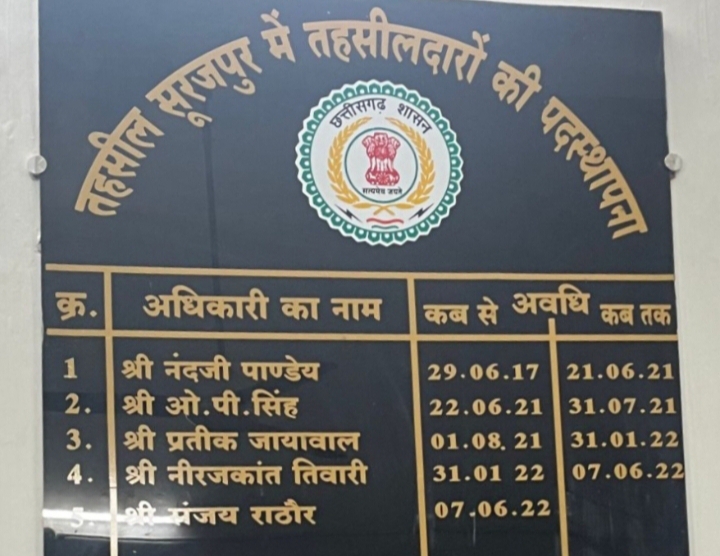 सूरजपुर में तहसीलदार नंदजी पांडेय लगभग चार साल तक सूरजपुर तहसीलदार के पद पर रहे। वे पूर्ववर्ती भाजपा शासन काल से वर्तमान चल रहे कांग्रेस शासन काल के दौरान तक पदस्थ थे। उनका कोरबा जिले के लिए डिप्टी कलेक्टर के रूप में पदोन्नति के पश्चात स्थांतरण हुआ था जबकि ऐसा क्या हुआ कि उनके स्थानांतरण के बाद डेढ़ वर्षो में पांच तहसीलदार का स्थानांतरण आदेश जारी हुआ। जिला मुख्यालय ही नहीं बल्कि जिले के अधिकांश तहसीलों में कमोबेश स्थिति यही है कि जब तक अधिकारी राजस्व प्रकरणों को समझ पाते, इससे पूर्व ही उनका स्थानांतरण आदेश जारी हो जाता है, ऐसे में राजस्व प्रकरणों का निपटारा कैसे हो पाएगा, ये बड़ा सवाल है। जबकि प्रदेश के मुखिया की मंशा है की राजस्व प्रकरणों के लिए पक्षकारों को तहसील के चक्कर न लगाना पड़े। राजस्व के लंबित प्रकरणों का निपटारा जल्द से जल्द करने के निर्देश सभी कलेक्टर को जारी कर उनको जवाबदेही तय किए गए है। बहरहाल जिला मुख्यालय में तहसीदार के पद पर डिप्टी कलेक्टर डा वर्षा बंसल को पदस्थ किया गया अब देखना यह है की उनका कार्यकाल लंबा रहता कि उनकी भी छुट्टी जल्दी कर दी जाती है !