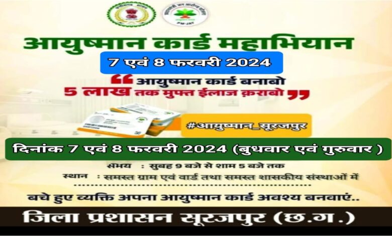 सूरजपुर – आयुष्मान भारत योजना के तहत अधिकाधिक लोगों को लाभ के लिए पात्रों को पांच लाख रुपये तक का निःशुल्क उपचार देने के लिए महाभियान चलाकर आयुष्मान कार्ड बनाये जा रहे है।आयुष्मान कार्ड महाभियान का आयोजन 07 से 08 फरवरी तक किया जाएगा। जिसमें स्वास्थ्य विभाग के द्वारा बचे हुए व्यक्ति अपना आयुष्मान कार्ड अवश्य बनवाएं।