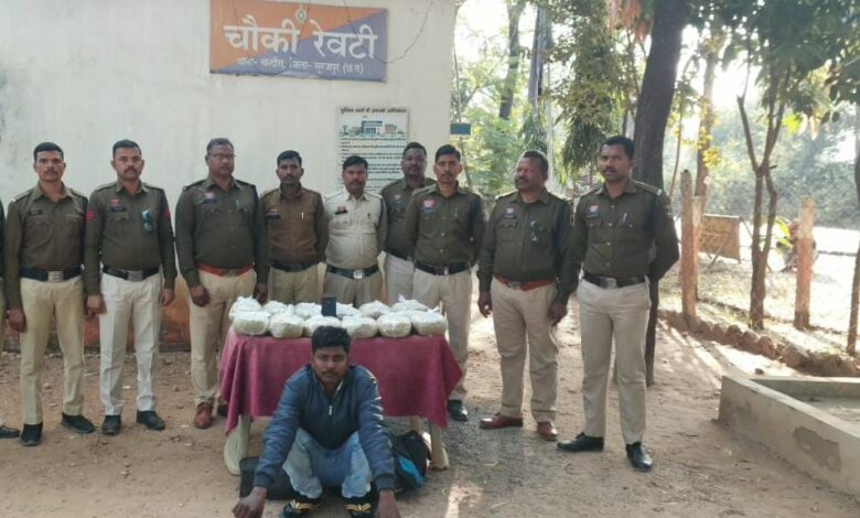सूरजपुर। जिले के चौकी रेवटी पुलिस ने अम्बिकापुर से रेनुकूट जाने वाली बस में गांजा ले जा रहे एक गांजा तस्कर को पकड़ा है जिससे 4 लाख रूपये कीमत के 12 किलो 300 ग्राम गांजा बरामद किया है। चौकी रेवटी पुलिस को मुखबीर से सूचना मिला कि अम्बिकापुर से रेनुकूट जाने वाली बस में एक व्यक्ति गांजा लेकर बिक्री करने बनारस जा रहा है।चौकी रेवटी पुलिस ने प्राप्त सूचना के आधार पर ग्राम चांचीडांड बनारस रोड़ पर नाकाबंदी कर बस की चेकिंग की जा रही थी इसी दौरान बस से एक व्यक्ति 2 बैग लेकर संदिग्ध हालत में भागने लगा जिसे घेराबंदी कर पकड़ा गया। पूछताछ पर उस व्यक्ति ने अपना नाम सोनू पटेल पिता मुरारी लाल उम्र 32 वर्ष निवासी इन्जानी,थाना चलगली जिला बलरामपुर बताया जिसके कब्जे से 12 किलो 300 ग्राम गांजा जप्त किया गया है जिसकी कीमत करीब 4 लाख रूपये है। मामले में गांजा जप्त कर धारा 20(बी) एनडीपीएस एक्ट के तहत कार्यवाही कर आरोपी को गिरफ्तार किया है।
