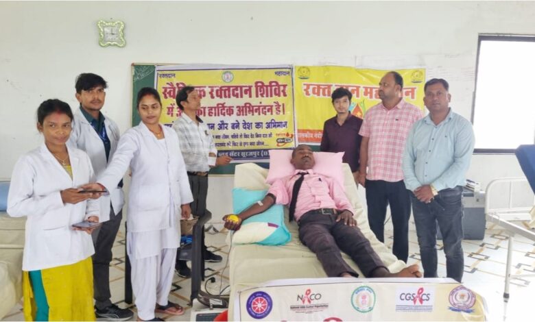 सूरजपुर। शासकीय नवीन महाविद्यालय चांदनी बिहार पुर में जिला चिकित्सालय सूरजपुर के दिशा निर्देशन में स्वेच्छिक रक्तदान शिविर का आयोजन महाविद्यालय के प्राचार्य रंजीत कुमार सातपुते कि मार्गदर्शन वं रेड क्रॉस रेड रिबन संगठन धीरेंद्र कुमार जायसवाल के उपस्थिति में संपन्न हुआ। शिविर आयोजन का मुख्य उद्देश्य रक्तदान करने के प्रति जागरूकता तथा रक्तदान करने के फायदे व रक्तदान करने से लोगों में व्याप्त भ्रान्तियों को दूर करना रहा। प्रत्येक व्यक्ति को जीवन में रक्तदान करना चाहिए। शिविर में सर्वप्रथम दीपक तिवारी बी.ए.अंतिम वर्ष के छात्र द्वारा रक्तदान कर शिविर का शुभारंभ किया गया। शिविर में 20 से अधिक रक्तदाताओं ने रक्तदान किया इस शिविर में मेडिकल ऑफिसर डॉक्टर अमन भगत एवं स्वास्थ्य केंद्र बिहरपुर तपेश्वर वं स्टाफ जिला चिकित्सालय सूरजपुर एवं जयप्रकाश वर्मा स्वास्थ्य केंद्र भैयाथान ने शिविर को सफल बनाने में अपनी महत्वपूर्ण भूमिका अदा की। शिविर में महाविद्यालय के सचिन मिंज, पिंटू कुमार गुप्ता,रामनिवास वं स्टाफ की सहभागिता रही। महाविद्यालय के छात्र-छात्राओं ने इस शिविर में अपना रक्तदान किया शिविर को सफल बनाने में शिवम तिवारी भारत सिंह,आशुतोष बैस,रवीना साहू, निभम जायसवाल आदि छात्र-छात्राओं का विशेष योगदान रहा।